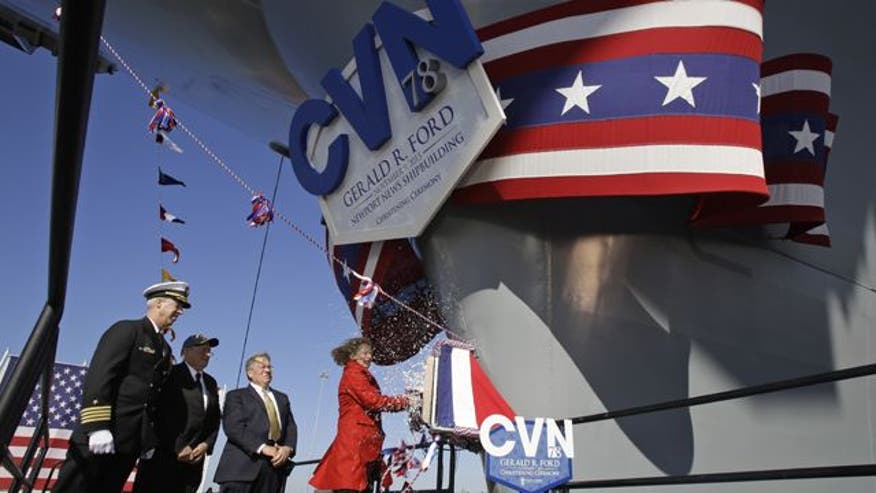 NORFOLK, Va. – The Navy christened the USS Gerald Ford on Saturday with the traditional smashing of a bottle of sparkling wine across the bow of the ship -- the most technologically advanced aircraft carrier the United States has built.