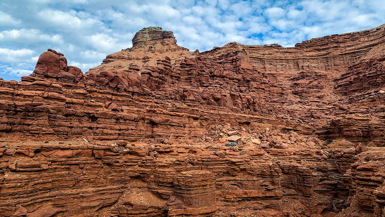 You'll have to squint really hard to see the vehicle, as it is shown from a great distance driving hidden on a rocky desert cliff.
