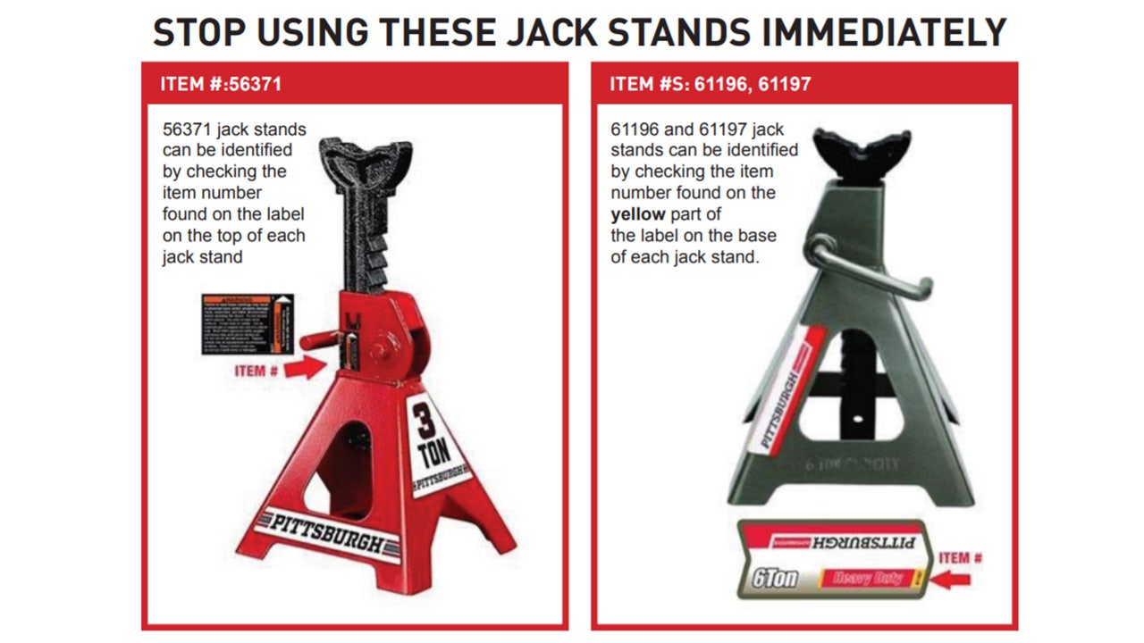 According to the company, the pawl on the Pittsburgh Automotive 3 Ton and 6 Ton Heavy Duty Steel Jack Stands may disengage from the lifting post if the weight shifts, allowing the post to drop.