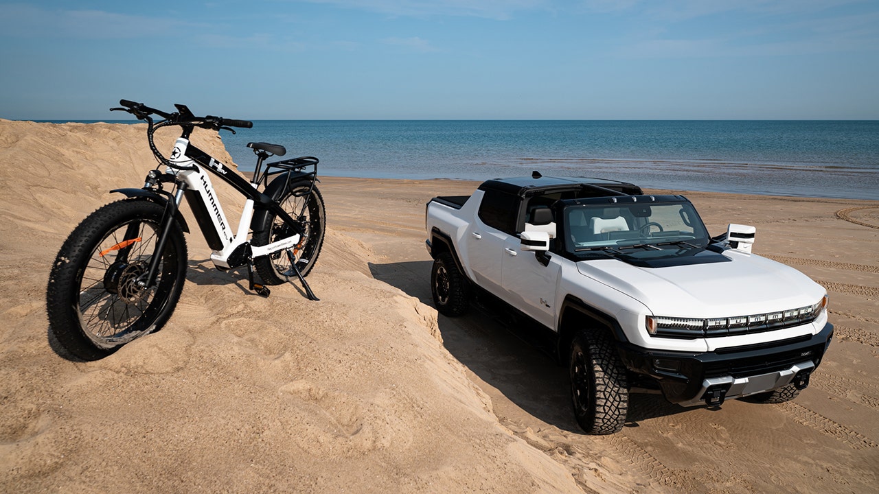 The 93-pound fat-tire bike is equipped with an adjustable front suspension and can handle a variety of surfaces, including sand, and it will fit down tight trails that the 86.7-inch wide Hummer EV pickup could only dream of navigating.