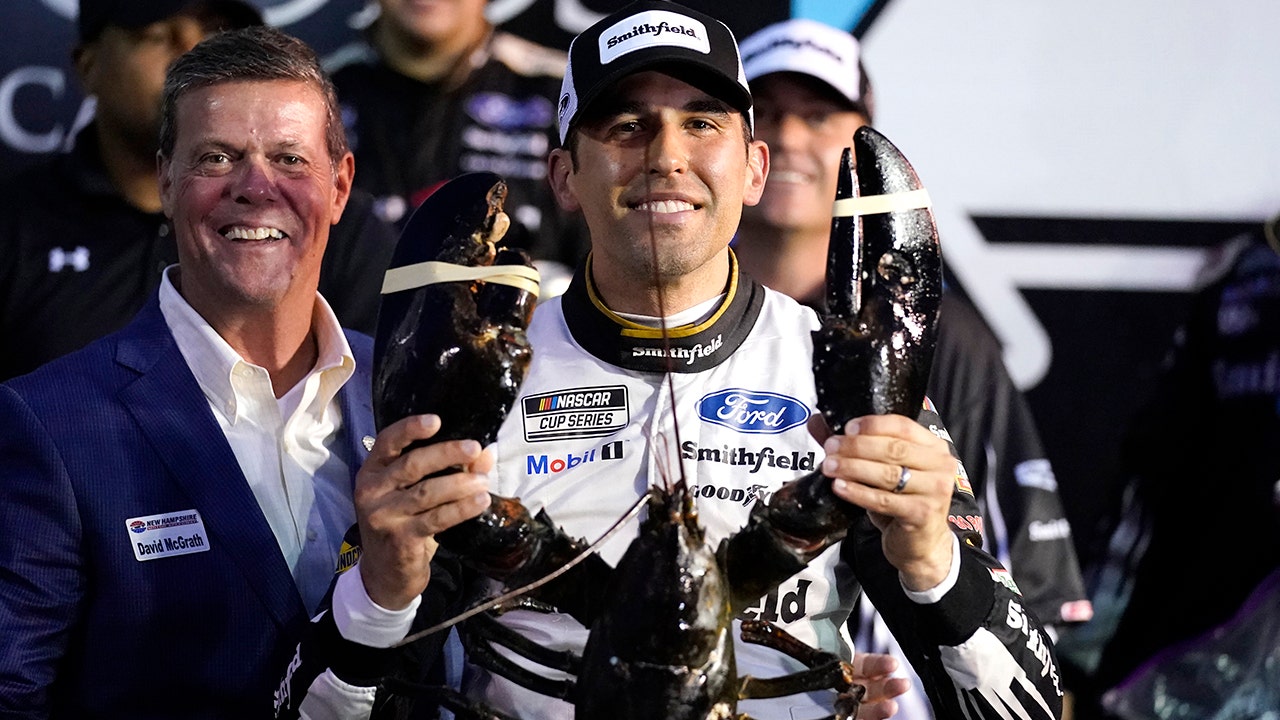 Aric Almirola smiles as he holds up a giant lobster after winning the NASCAR Cup Series auto race Sunday, July 18, 2021, in Loudon, N.H. At left is Dave McGrath, general manager of New Hampshire Motor Speedway. (AP Photo/Charles Krupa)
