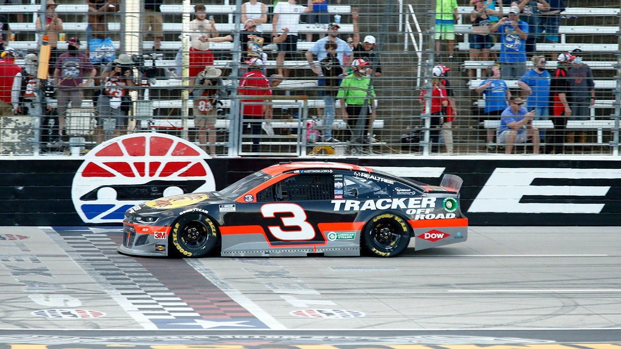 Austin Dillon crosses the finish line to win the NASCAR Cup Series auto race at Texas Motor Speedway in Fort Worth, Texas, Sunday, July 19, 2020. (AP Photo/Ray Carlin)