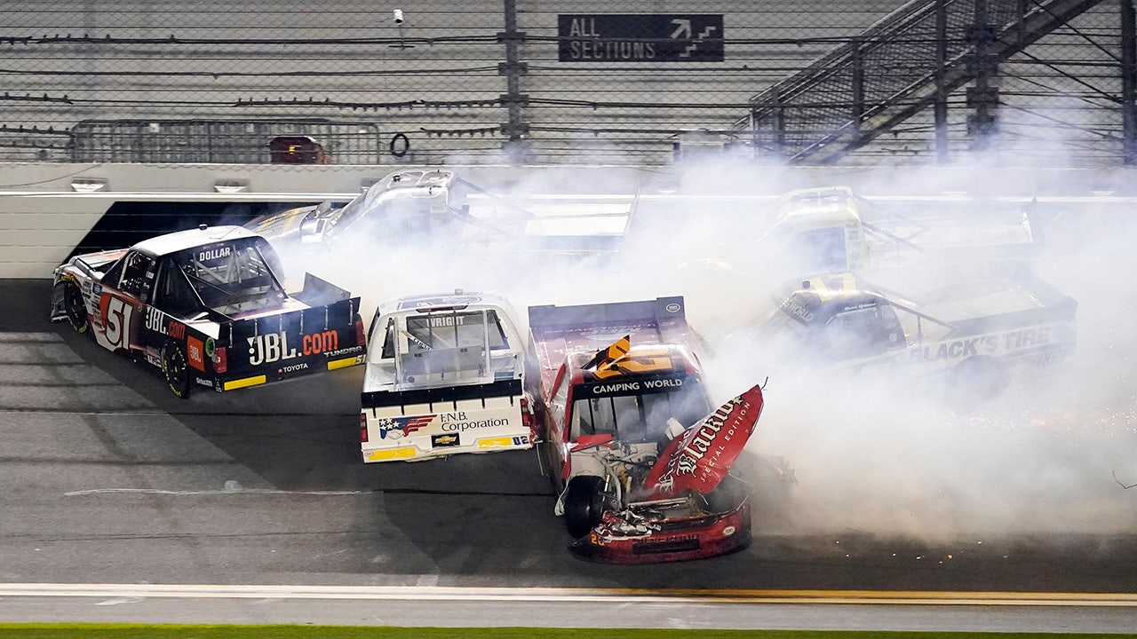 Ben Rhodes passed Cory Roper in the final turn of the NextEra Energy 250 NASCAR Camping World Truck Series race on Friday night as several cars got caught up in a wreck behind them in a wild finish to the season-opener.
