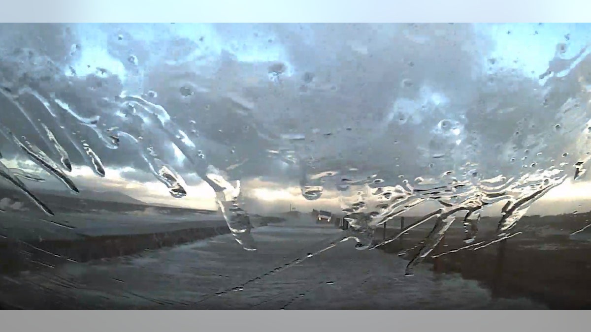 Dashcam video: A car slammed by waves in North West England narrowly escapes the flood waters.
