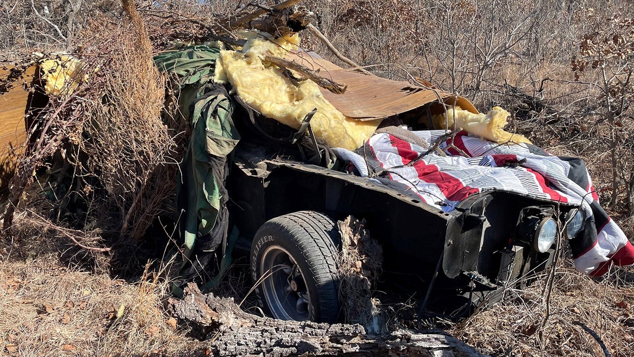 Police said the car was found hidden under brush and cardboard boxes, and photos show it covered with tarps. The doors, front fenders, hood and grille were stripped off and missing, but its 428-cubic-inch V8 was still in the car.