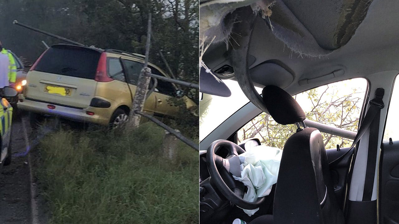 The 21-year-old man reportedly wrecked in a fog near Kirby Muxloe, U.K., causing a long metal pole to enter his driver’s side window and pass just inches from his head as it pierced the roof of his car.