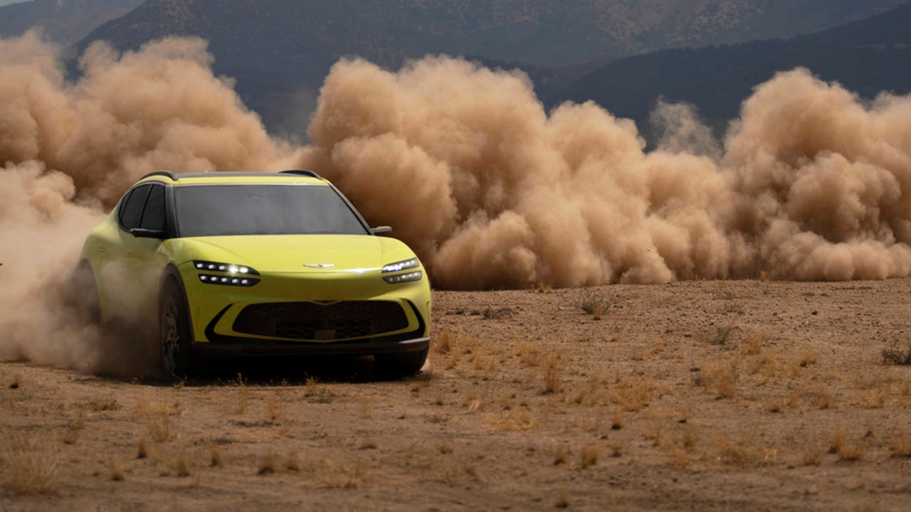 The Genesis GV60 electric vehicle features a chrome strip of trim along its roofline that's shaped like a lightning bolt. (Genesis)