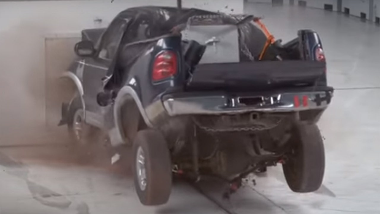 One of the test trucks was a two-decade-old Ford F-150 with a bed full of ballast. The truck wasn't being tested for its own crash performance with the load, just acting as a conveyance for the weight. As it turns out, the frontal structure visibly held up surprisingly well, but the load went straight into the cabin.