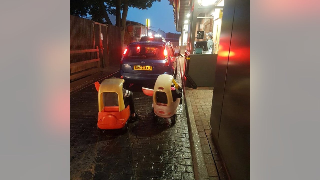 Two sisters looking to get their McDonald’s fix after weeks of lockdown in the U.K. hopped in a pair of Little Tikes Cozy Coupes and hit the drive-thru last week.