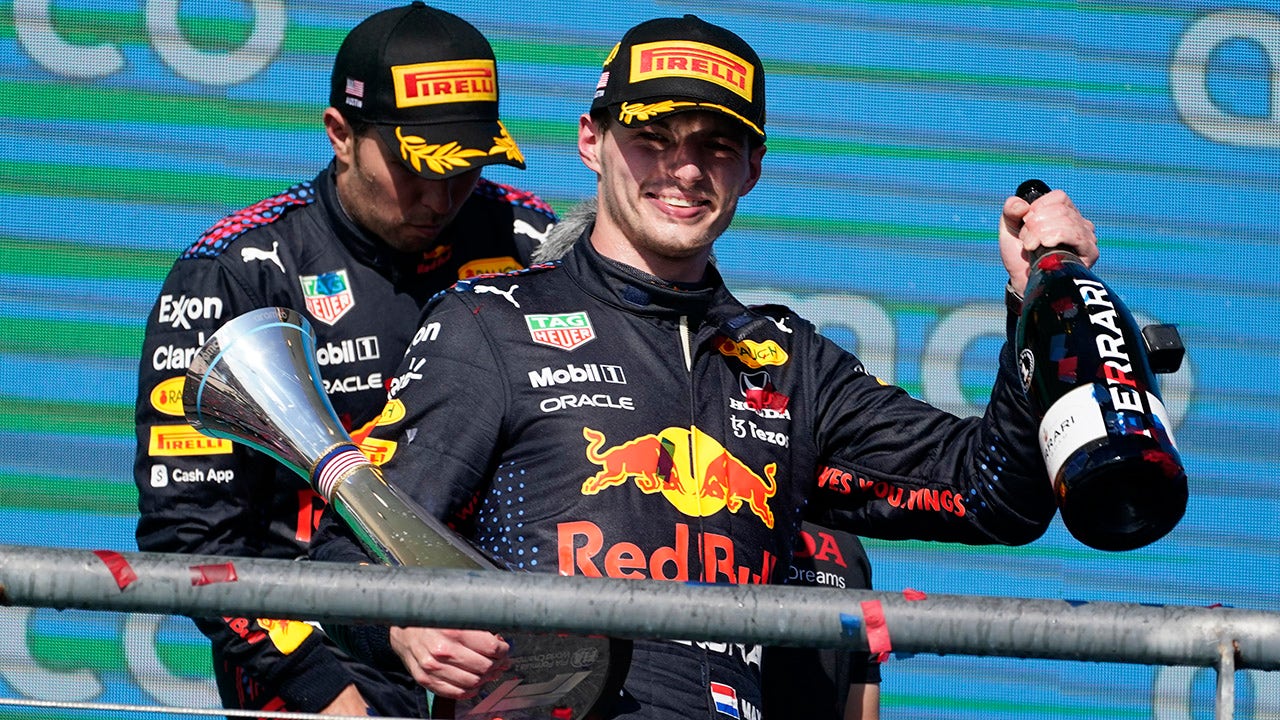 Red Bull driver Max Verstappen, front, celebrates is U.S. Grand Prix victory. (AP)