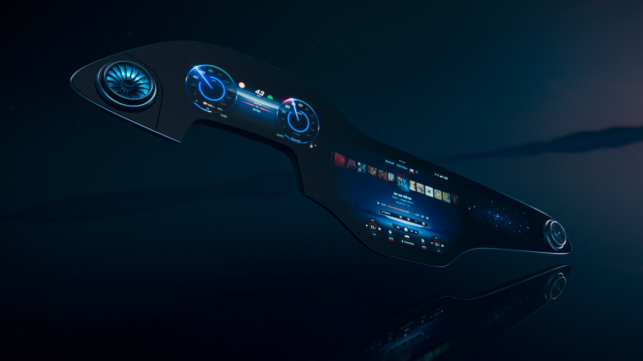 The curving, scratch-resistant surface isn't a continuous screen, however, but covers three OLED displays that include an instrument cluster, a central infotainment/climate-control interface and a screen in front of the passenger seat. It also has two air vents poking out of it to help "connect the digital and physical world," according to Mercedes-Benz.