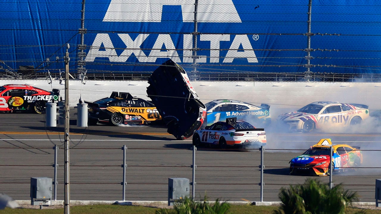 Burton's Wood Brothers Racing Ford Mustang landed on its roof, but was hit again and knocked back onto its wheels. Burton was OK, but his race was over, along with those of Byron, Denny Hamlin and Ross Chastain, while several other cars suffered damage that required long pit stops for repairs.