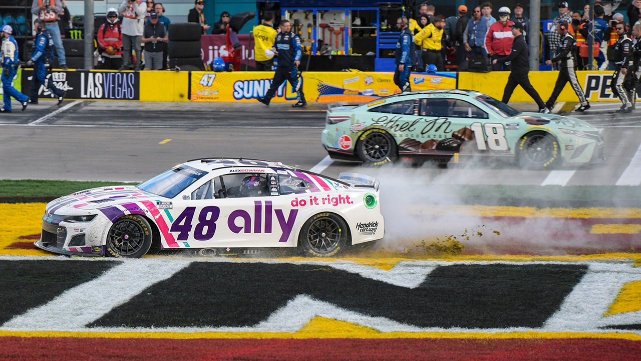 Alex Bowman in the No. 48 car won the NASCAR Cup Series race in Las Vegas during overtime, while Kyle Busch in the No. 18 car finished fourth. (Sam Morris/LVMS/Icon Sportswire via Getty Images)