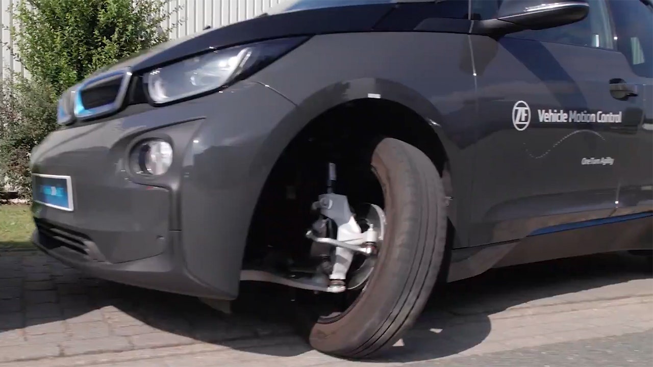 ZF has installed it onto an electric BMW i3 to demonstrate how a car can make a U-turn by essentially pivoting around the rear wheels within the space of a single lane road.