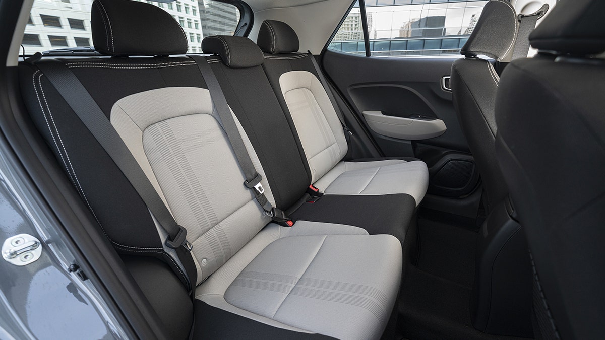 Front seat space is generous with two aboard, and if they sacrifice a little legroom the Venue’s upright shape allows four adults to fit reasonably well. The trunk is equally capacious and just a half cubic-foot smaller than the larger, more expensive Hyundai Kona’s. Rear seat passengers do have to live without center armrest or cupholders, though. There's just bottle pockets in the doors.