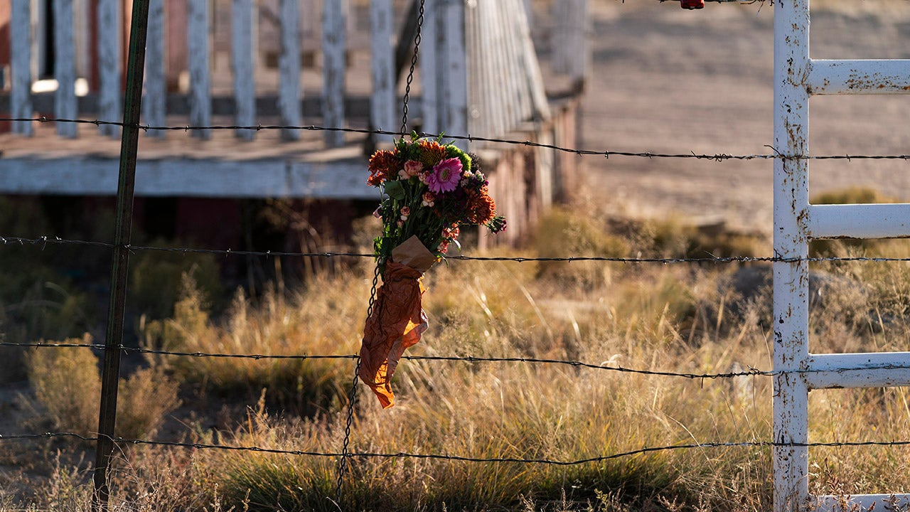 A bouquet of flowers is left to honor cinematographer Halyna Hutchins outside the Bonanza Creek Ranch. (AP Photo/Jae C. Hong)