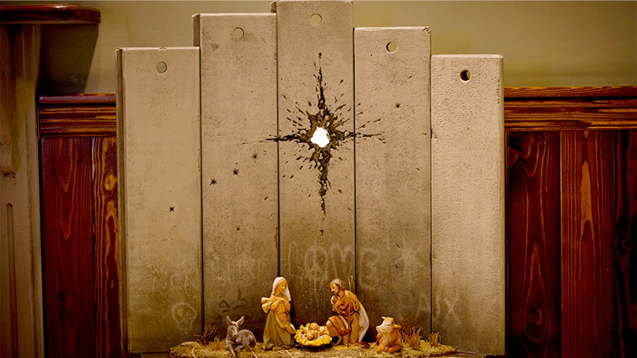 Calling it “Scar of Bethlehem,” the artwork, as The Associated Press reported, depicts the birth of Jesus under Israel’s West Bank separation barrier with a bullet hole shaped like a star. The piece is displayed at the Walled Off Hotel, a Palestinian guesthouse in Bethlehem that was designed by Banksy and is filled with his artwork.