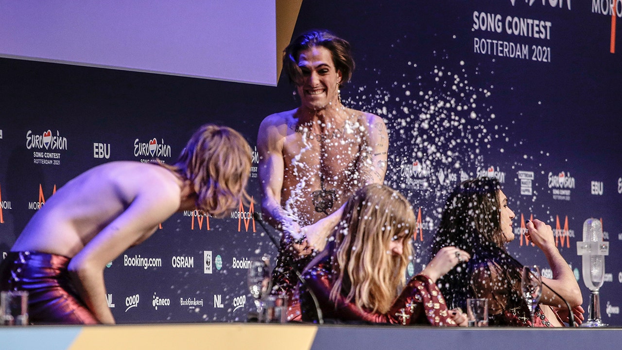 Damiano David, centre, sprays champagne onto Thomas Raggi, from left, Victoria De Angelisa and Ethan Torchio at the press conference after their band Maneskin from Italy won the Grand Final of the Eurovision Song Contest at Ahoy arena in Rotterdam, Netherlands, Saturday, May 22, 2021. (AP Photo/Peter Dejong)