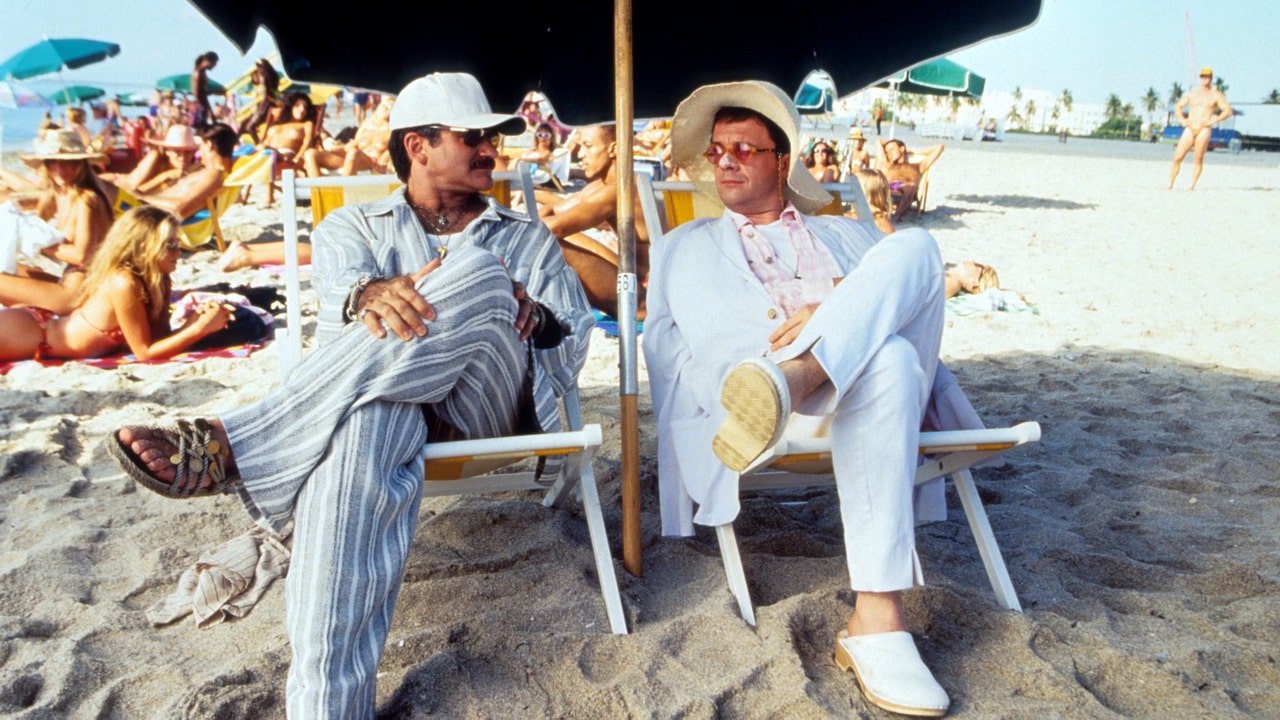 Robin Williams (L) and Nathan Lane (R) sitting under an umbrella on the sand at the beach in a scene from the film 'The Birdcage,' 1996. (United Artists/Getty Images)