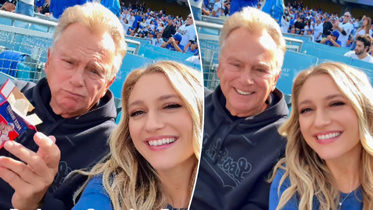 Pat Sajak is seen snacking on what appears to be a box of Cracker Jacks, as he is all smiles in the stadium with his daughter. (Maggie Sajak/Instagram)