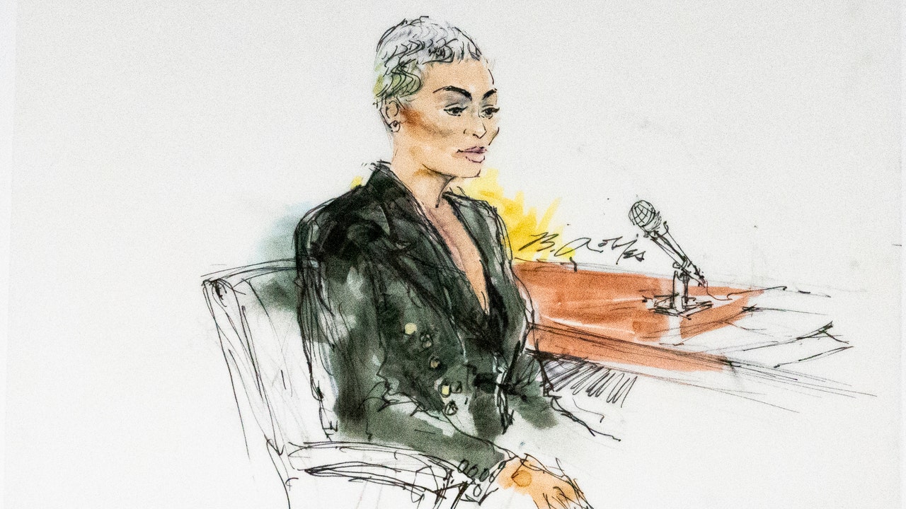 In this courtroom artist sketch, former reality television star Blac Chyna sits in court in Los Angeles, Tuesday, April 19, 2022. A jury has been seated in the trial that pits model and former reality television star Blac Chyna against the Kardashian family, who she alleges destroyed her TV career. (Bill Robles via AP) (AP)