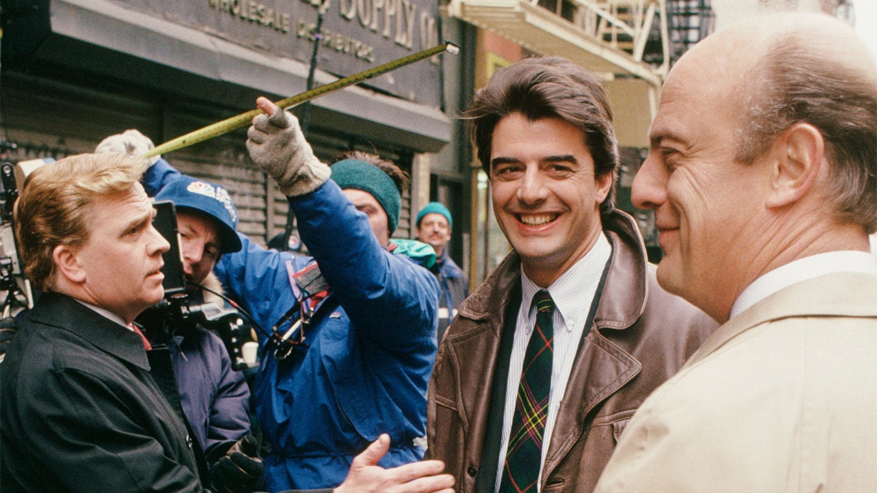 Chris Noth, who played junior detective Mike Logan, John Christopher Jones, who played Dennis Shearer, and Gerry Bamman, who played internal affairs Lt. Kennedy, were acting in a scene together in the photo.