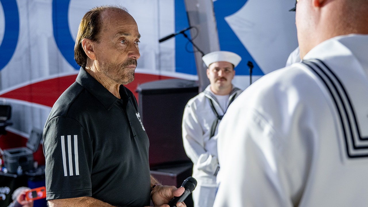 Lee Greenwood with members of the United States Navy during a visit to "FOX &Friends" at Fox News Channel Studios on May 27, 2022, in New York City. (Roy Rochlin)