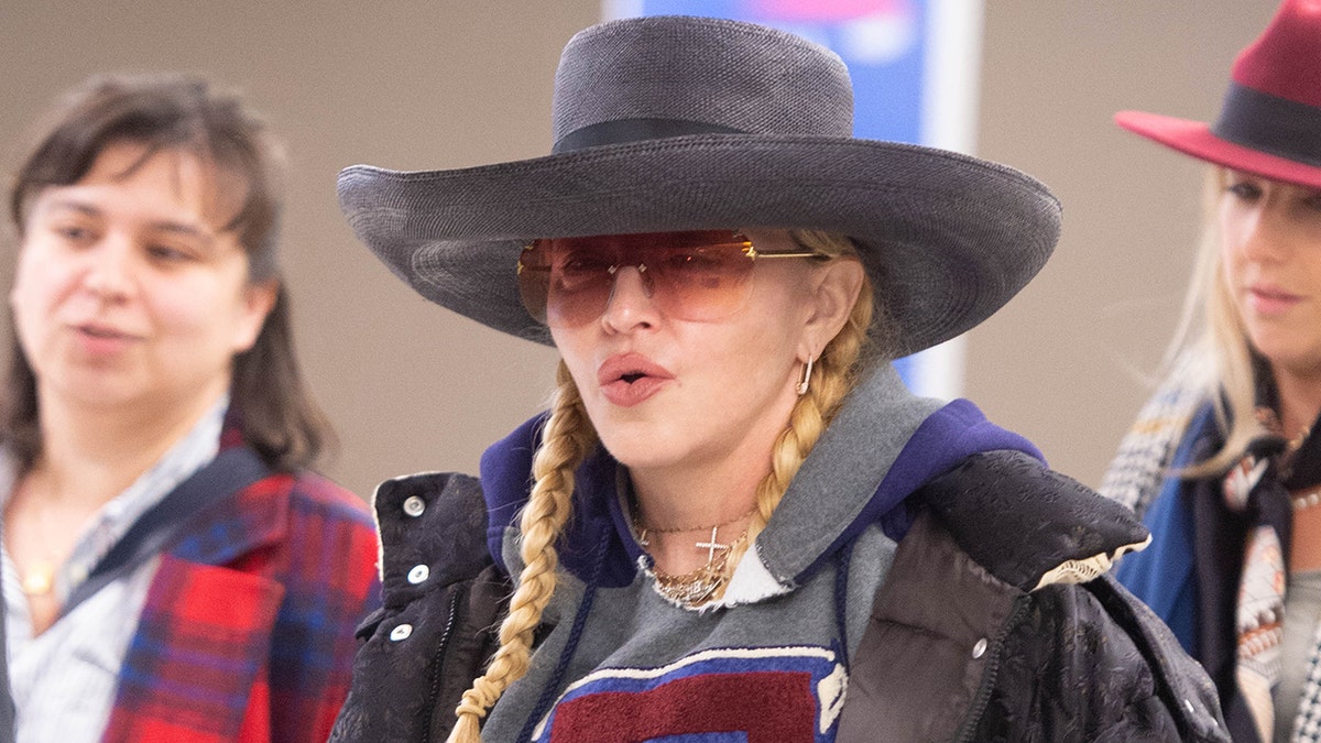 Most recently, Madonna wore the jacket while walking through JFK airport in NYC on Sunday, pairing the statement piece with a fur-lined leather trapper hat, a black and white American flag scarf, black sweats and a controversial pair of $1,195 Dolce & Gabbana studded sneakers that feature a music note alongside the words “I’m thin & gorgeous.”