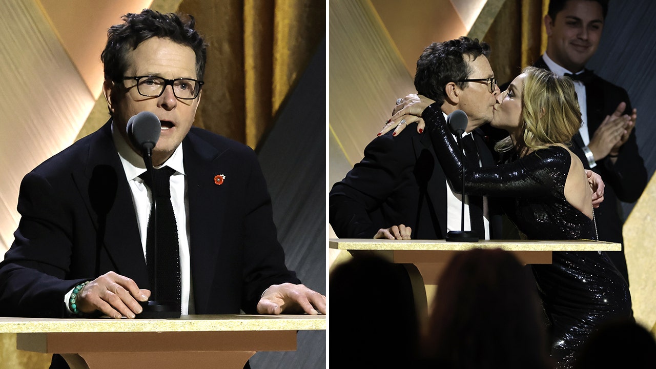 Michael J. Fox is given a kiss on stage from his wife Tracy Pollan after receiving the Jean Hersholt Humanitarian Award. (Kevin Winter)
