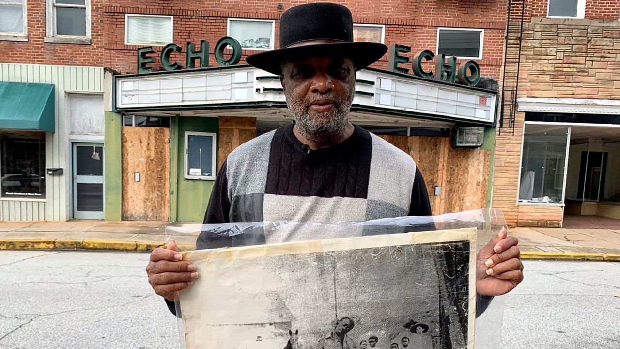 In this Monday, Jan. 13, 2020 photo, Rev. David Kennedy stands outside the Echo Theater holding a photo of his great uncle's lynching, in Laurens, S.C. Kennedy has fought for civil rights in South Carolina for decades. (AP Photo/Sarah Blake Morgan)