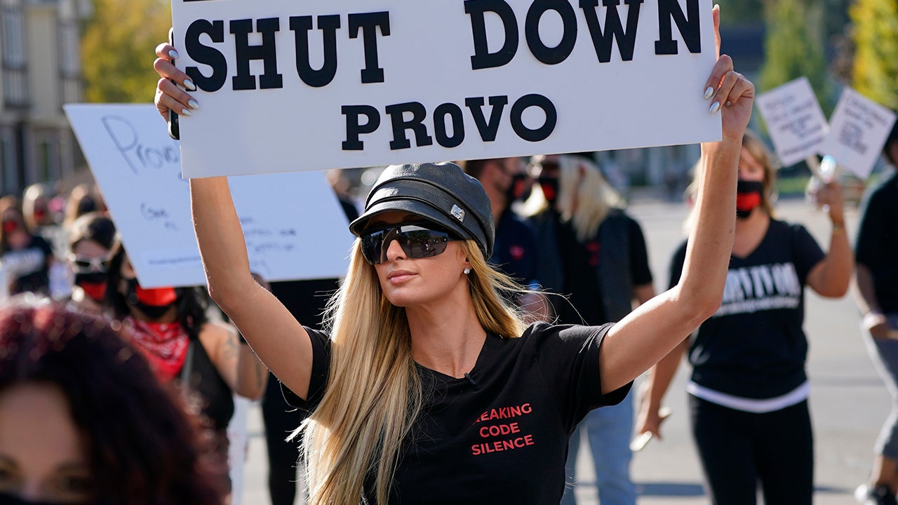 Paris Hilton, 39, is joined by several other protesters in Utah on Friday. (AP Photo/Rick Bowmer)