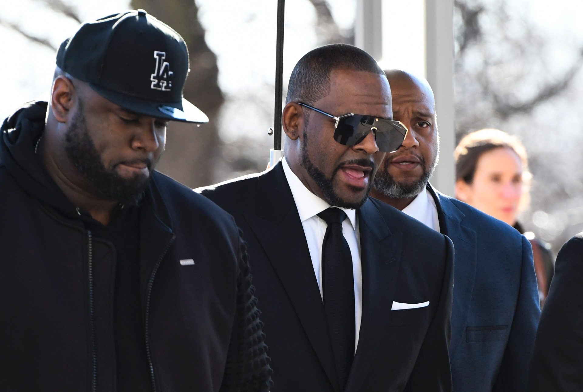Musician R. Kelly, center, arrives at the Leighton Criminal Court building for a hearing Tuesday, May 7, 2019, in Chicago. (AP)