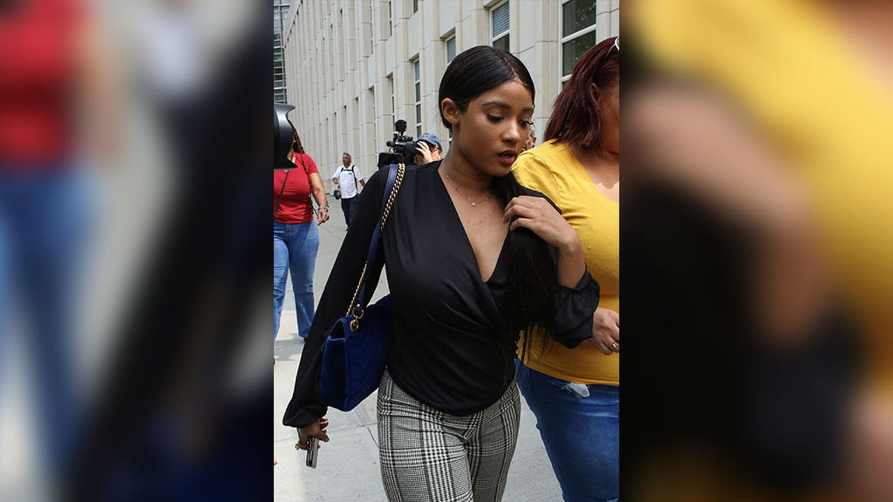R. Kelly's girlfriend, Jocelyn Savage (L), leaves after a hearing in the racketeering and sex trafficking case of Kelly at Brooklyn federal court on August 2, 2019 in New York. - R&B singer R. Kelly pleaded not guilty in a New York court to federal charges including racketeering that allege he systematically recruited girls for sex while touring. (KENA BETANCUR/AFP via Getty Images)