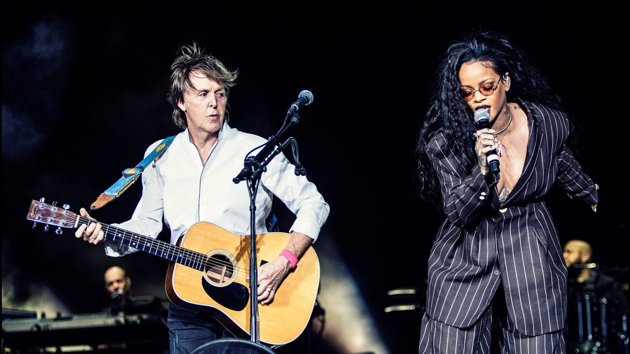Paul McCartney (L) and Rihanna perform on Day 3 of Desert Trip Weekend 2 at the Empire Polo Field on October 15, 2016 in Indio, California. (MJKIM/MPL Communications via Getty Images))