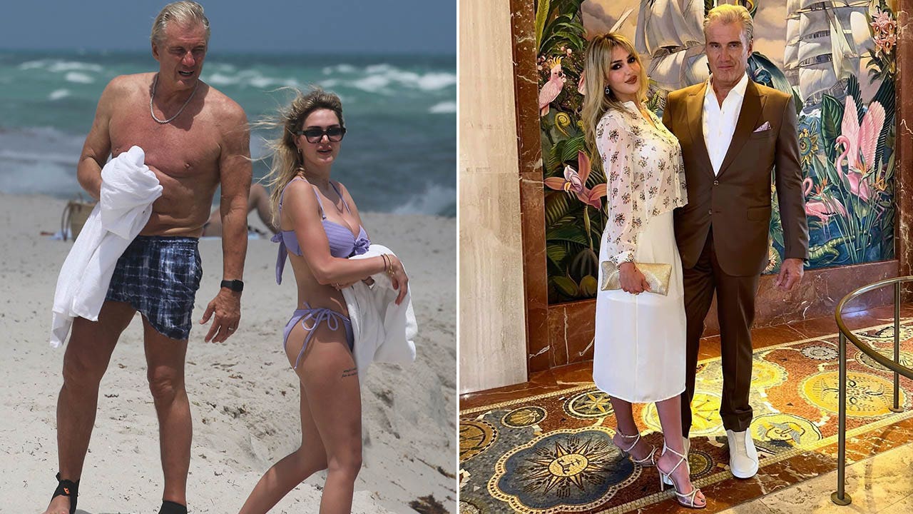 Dolph Lundgren and his wife Emma Krokdal, who is almost 40 years younger, were spotted on the beach in Miami. (Mega Agency/Dolph Lundgren Instagram)