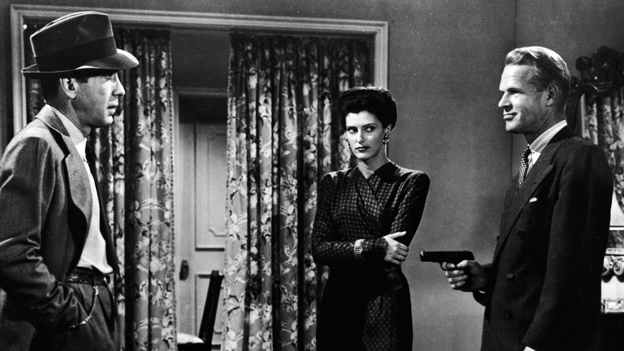 American actors (left - right): Humphrey Bogart, Sonia Darrin, and Louis Jean Heydt (1905 - 1960) in a still from the film, 'The Big Sleep,' directed by Howard Hawks, 1946. (Warner Bros./American Stock/Getty Images)