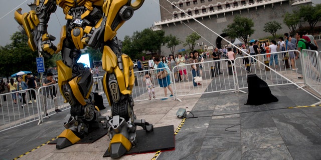 June 21, 2014. A child stands on a barricade fence looks at a replica model of Transformers character Bumblebee on display in front of Qianmen Gate, as part of a promotion of the movie "Transformers: Age of Extinction" in Beijing, China. (The Associated Press)