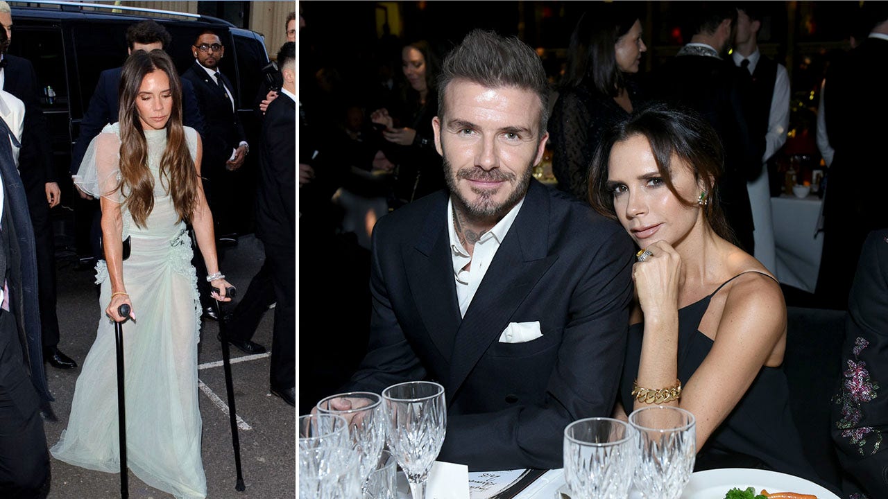 Victoria Beckham entered her 50th birthday party using crutches. (The Image Direct)