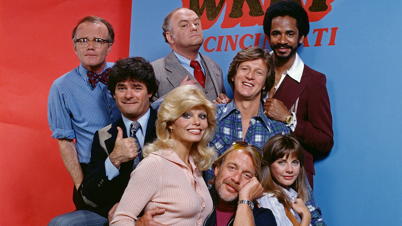 Pictured left to right: Richard Sanders (as news director Les Nessman), Frank Bonner (as advertising salesman Herb Tarlek), Loni Anderson (as receptionist Jennifer Marlowe), Gordon Jump (as general manager Arthur 'Big Guy' Carlson), Howard Hesseman (as morning disk jockey Dr. Johnny Fever), Gary Sandy (as radio program director Andy Travis), Jan Smithers (as assistant and traffic coordinator Bailey Quarters) and Tim Reid (as nighttime disc jockey Venus Flytrap) star on WKRP in Cincinnati, a CBS television situation comedy about characters at a radio station. Originally broadcast September 18, 1978. (Photo by CBS via Getty Images)