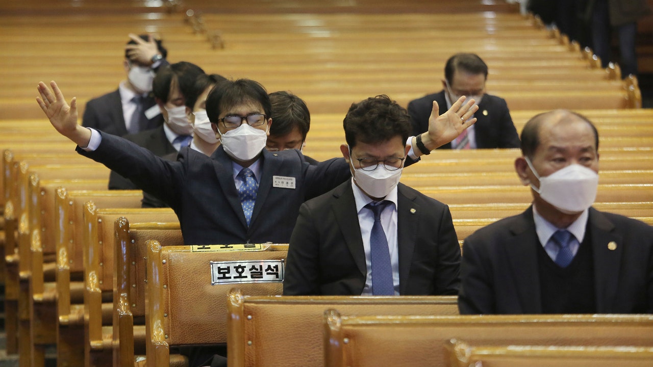 People wearing face masks pray during Mass at the Yoido Full Gospel Church in Seoul, South Korea, Sunday. The church decided to replace Sunday services with online ones for members' safety amid the spread of the COVID-19. (AP Photo/Ahn Young-joon)