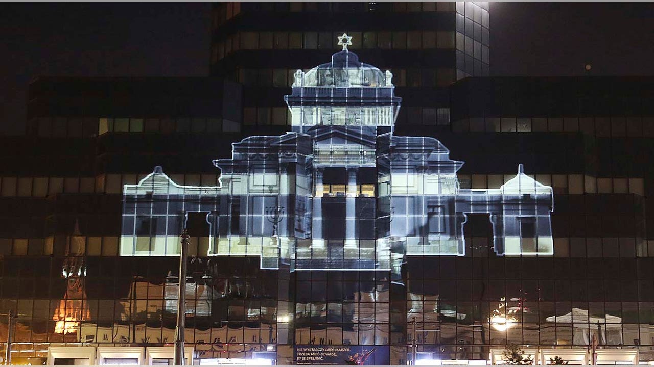 Thursday night, the Great Synagogue of Warsaw, which was once the largest in the world, re-appeared in the form of a blue-light image in the city.
