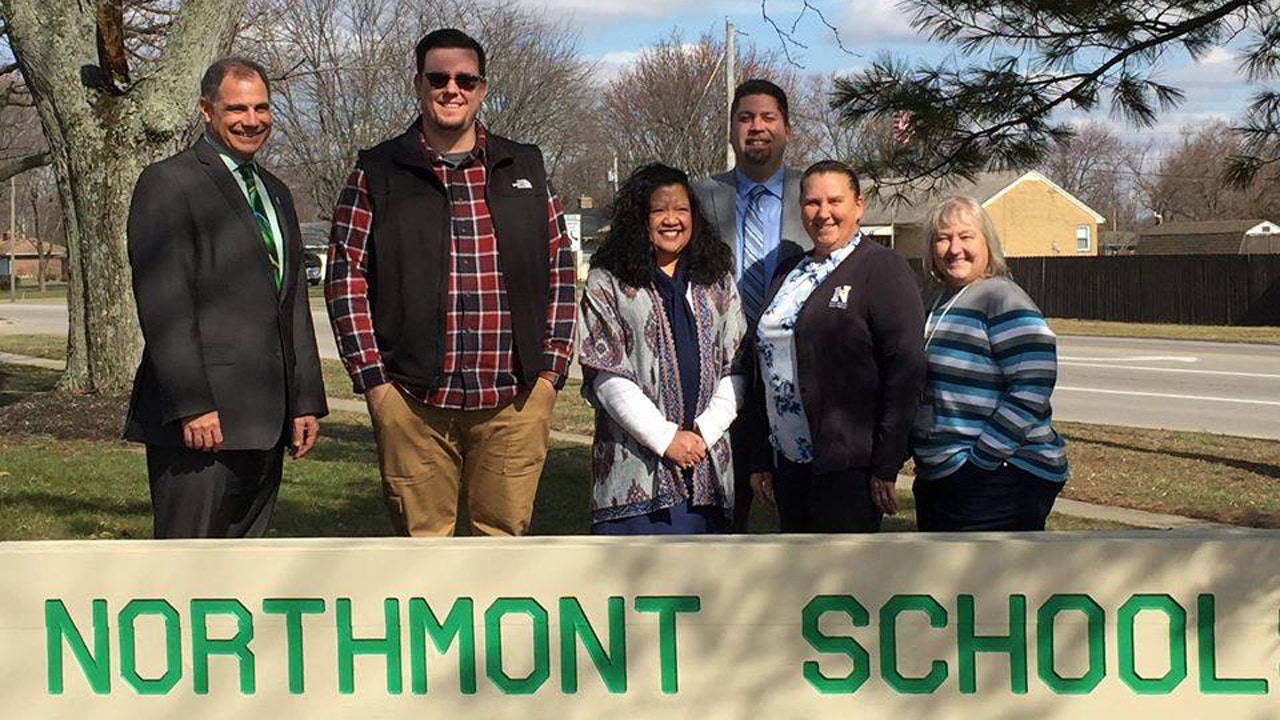 Bob Hawker, the Next Steps pastor at Salem Church of God, is pictured in the vest with the staff at Northmont School. The church helped pay off thousands of dollars in student lunch debt. (Northmont City Schools)