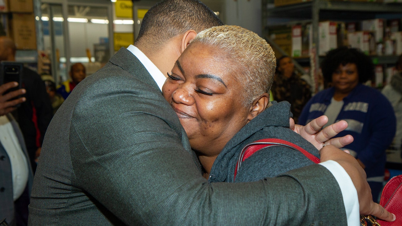 Suwanda McCreary hugs Cascade United Methodist Church senior pastor, Kevin Murriel, after his church paid for $10,000 worth of items in layaway at an Atlanta-area Walmart. McCreary's 28-year-old son died in April and he left three kids behind. She said it meant a lot to her. (Douglas Simmons/Dream Images Productions)