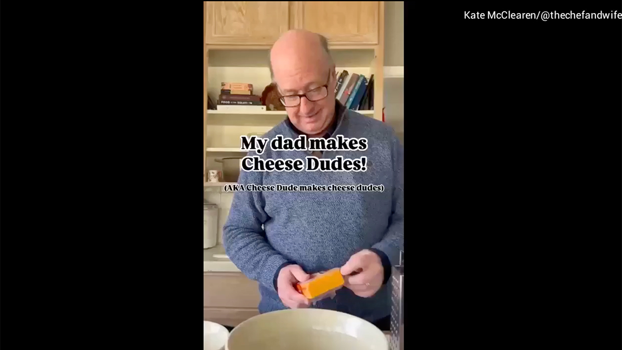 Jason and Kate McClearen, a Michigan-based content creator team known as "The Everyday Chef and Wife," let the camera roll in the kitchen as Kate's dad takes viewers through his hilarious process for making Cheese Dudes from scratch.