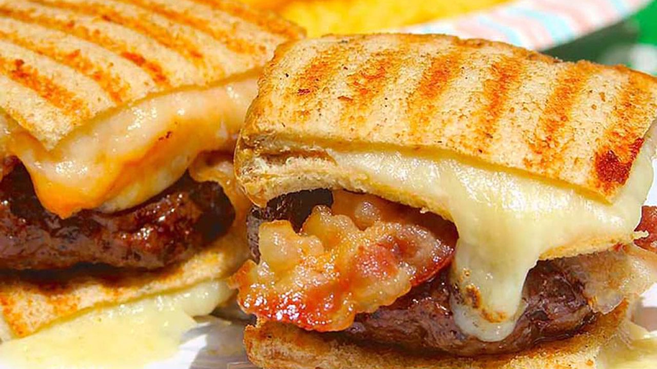 4. Grill burgers until they reach an internal temperature of 160 °F. Place each patty on a grilled cheese section, top with 2 small slices of bacon and another grilled cheese section. Serve immediately.