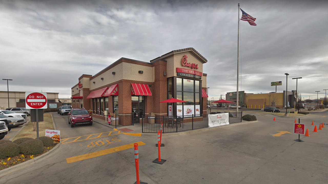 Footage from the Chick-fil-A, reportedly taken on Friday night at a Chick-fil-A location in Oklahoma City, Okla., shows the customers hopping through the window as an employee beckons both inside. (Google)