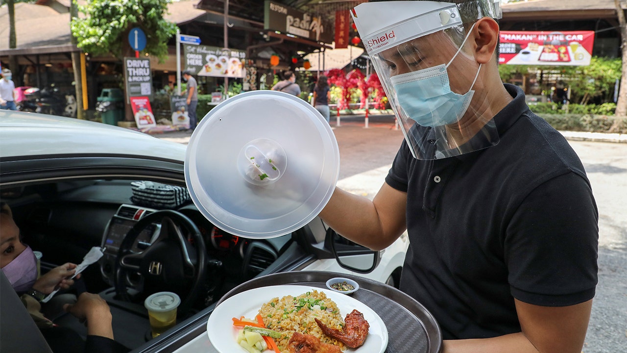 A waiter serves a customer outside Padi House restaurant for 'dine in car' service. (REUTERS/Lim Huey Teng)