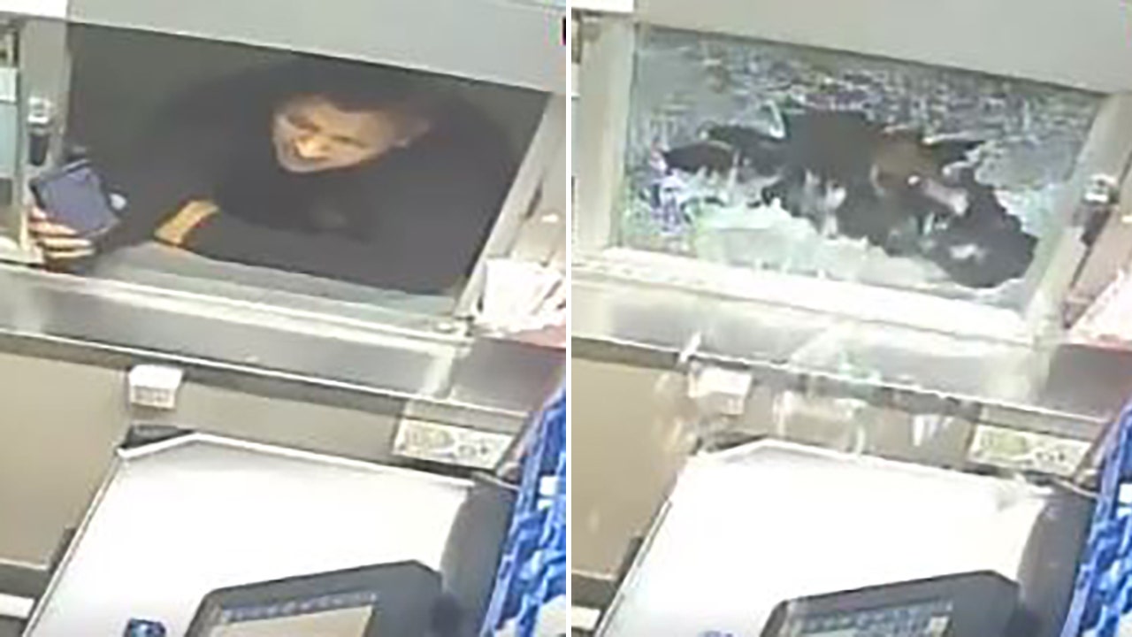 Police shared surveillance video of the suspect sliding open the drive-thru window and appearing to yell at the teen worker. He then closes the window and smashes it before fleeing the scene.