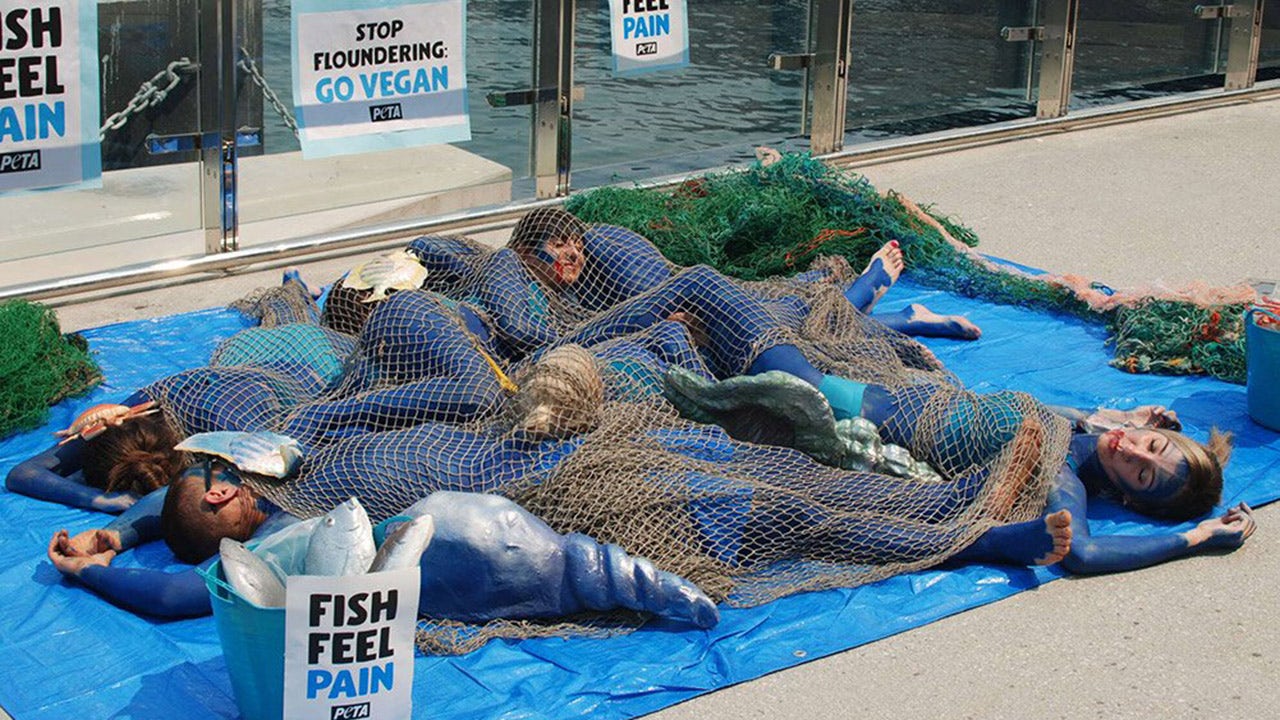 To make their case, the dead-serious protesters laid out on a blue tarp, with their tangled limbs painted blue, and blood-like red paint dripping from their mouths. A large net and fake fish were draped over their bodies, which were surrounded by signs with messages reading, “Stop floundering, go vegan" and "Fish feel pain."