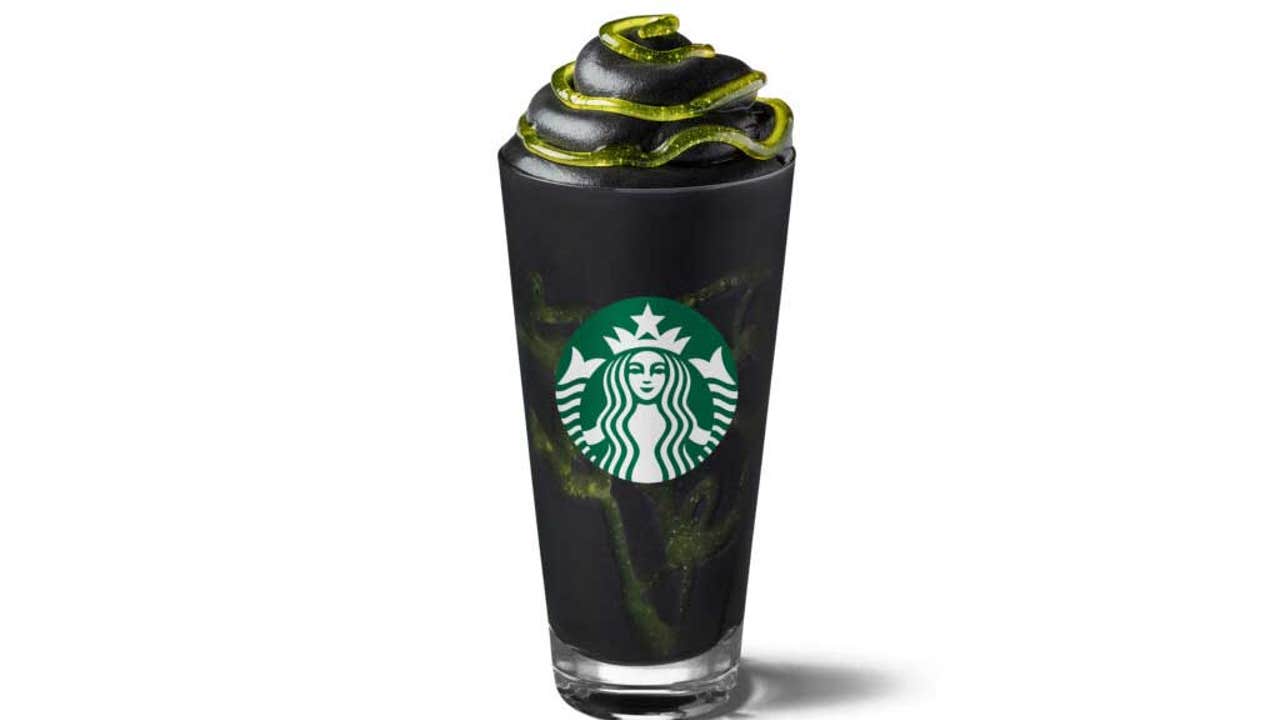 The black-and-green Frappuccino, which is only available for a limited time, is made with coconut milk, "mango essence" and a "ghoulish lime slime made with spirulina," according to a press release shared with Fox News. (Starbucks Spain's Instagram account claims there's also pineapple blended into the beverage.) Many of those ingredients, however, are masked by the addition of activated charcoal, which gives the Frappuccino its arguably unseemly hue.